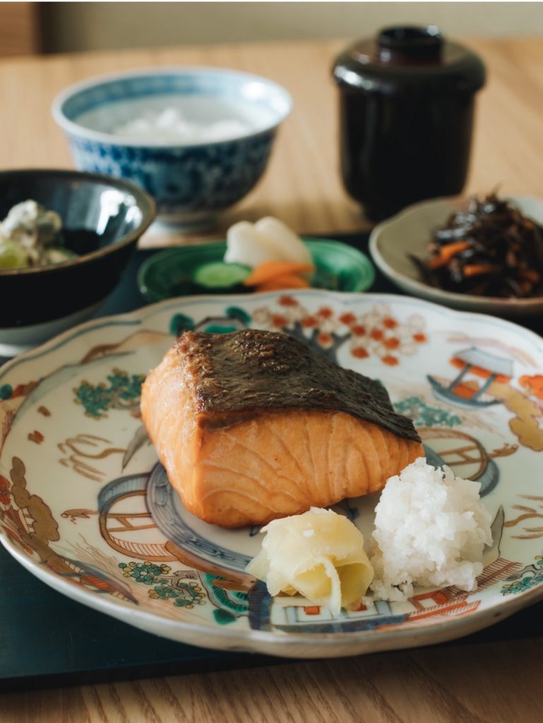seasonal starter, aemono (vegetables with Japanese dressing), main dish from several choices & freshly cooked rice.